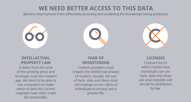 Vor demselben Hintergrund läuft aktuell eine europaweite Diskussion um die Freigabe von Zeitschrifteninhalten für die Forschung: Von den Verlagen (ergänzt am 11.5.: und den Betreibern von Repositorien) wird gefordert, dass sie ihre Inhalte für Text Mining frei zur Verfügung stellen. Am 6. Mai 2015 wurde die Hague Declaration on Knowledge Discovery in the Digital Age veröffentlicht. Ergänzung vom 11.5.15: Forschende und Bibliotheken sind eingeladen, die Erklärung zu unterzeichnen (ich persönlich habe sie schon…).