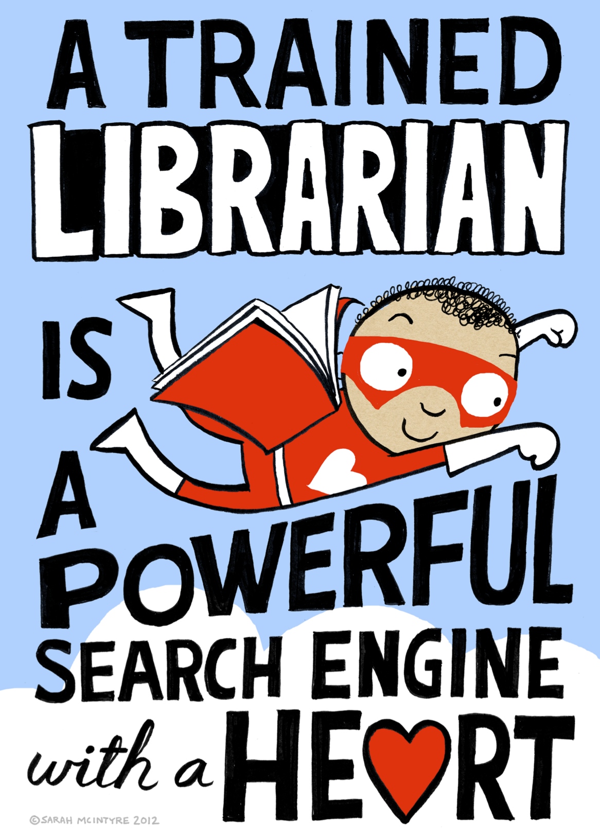 Das von Sarah McIntyre für eine Bibliothekskampagne in den USA geschaffene Plakat mit dem Slogan „a trained librarian is a powerful search engine with a heart“ gibt der Hoffnung Ausdruck, dass die persönliche Vermittlung einen echten Mehrwert darstellt.