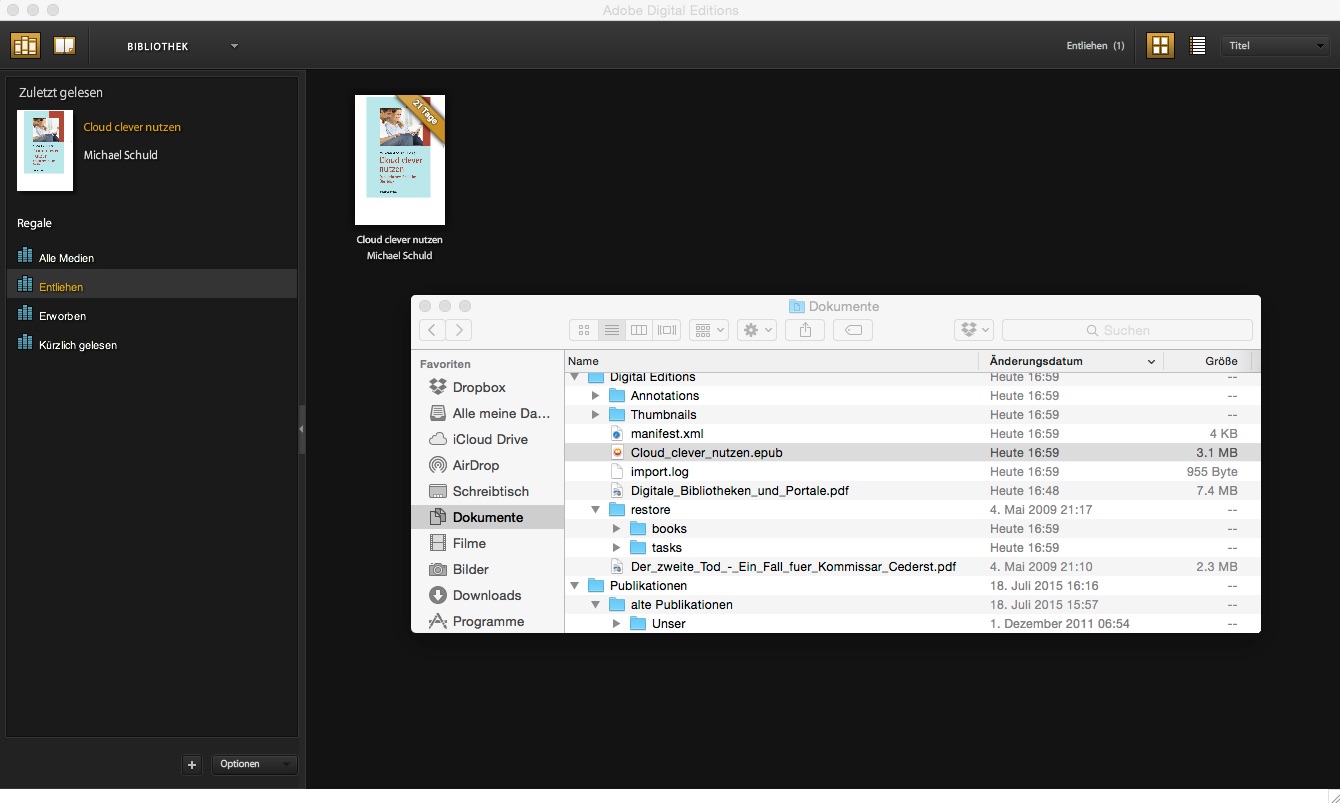 Hier sieht man das File im Dateiverzeichnis vor dem geöffneten Adobe Digital Editions (Mac-Version). Die Files bleiben da, auch wenn das E-Book zurückgegeben und aus Adobe Digital Edition entfernt wurde. Und nur so unter uns: es lässt sich mit entsprechenden Hilfsmitteln auch weiterhin öffnen (gemäss Schweizerischem Urheberrecht zumindest heute noch zulässig für private Zwecke…).