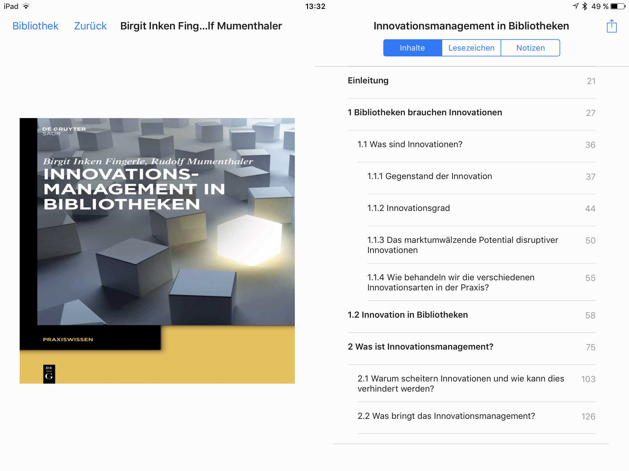 Another impact of e-books is how scientific scholarly documents are read. It is a standard that e-books are published like volumes of an e-journal: each chapter is a separate PDF document (according to an article in a volume). The download of a complete book is not allowed because this would be a copy of a complete work. This makes users read only the chapter they are really interested in and they don’t read the context of the information. This leads to a fragmentation of information. Another aspect is the bad usability of this kind of documents: the files have no specific name and have no integrated metadata. So, if you download a file, you have to rename it and organize the files on your desktop in order to find the information later on. Another issue with e-books (and e-journals) is the exclusion of non-members of the faculty. This is quite a serious problem for academic libraries in Europe, because they are usually also libraries open to the public. But this user group has got no remote access to the licensed electronic documents. A solution could be to lend the e-books electronically (e-lending). This service is offered more and more by public libraries, but hardly by academic libraries. Another question is how the usage of e-books on mobile devices as e-reader or tablets can be supported by libraries. One important task is to offer e-books in a format that can be used on these devices. Another service can be training and support for the usage of tablets and e-readers.