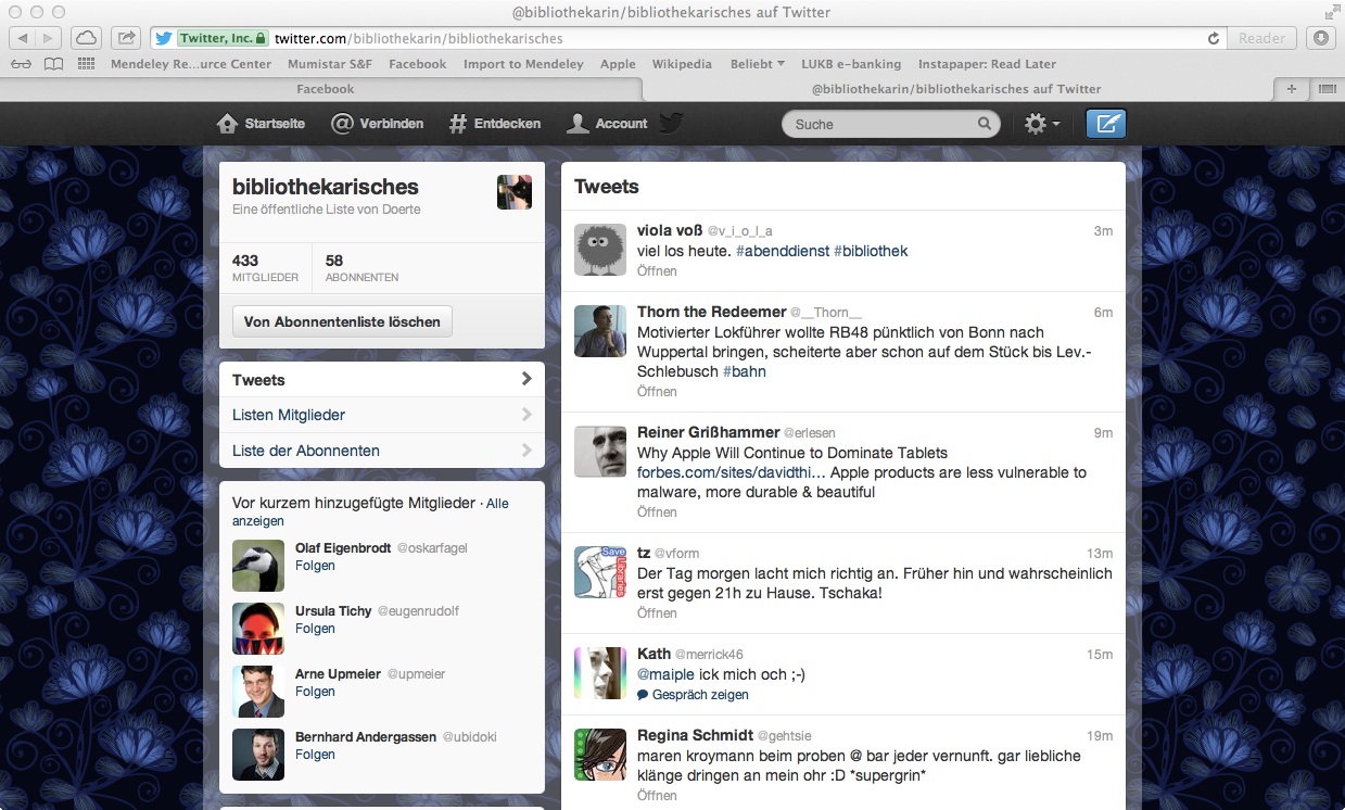 And you know who makes this effort creating lists? Right! Librarians. Thus also on Twitter, the basic problem is that usually the community of librarians follows the news from other libraries, but hardly the users of libraries. As an information source for librarians I find Twitter incredibly important. And it’s really great to read these lists with the app Flipboard on the iPad (or on another tablet) so that you can scroll as in a commercial magazine. But Twitter is less fitted to spread information about the library directly to customers.