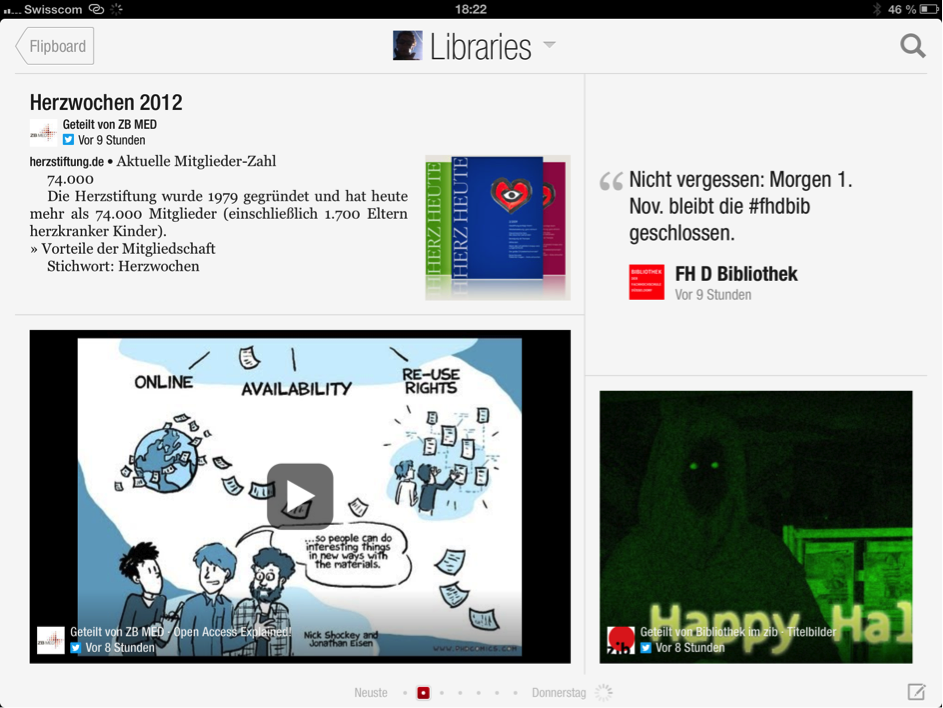 Als Informationsmedium für Bibliothekare finde ich Twitter enorm wichtig. Richtig elegant wird es, wenn man diese Listen in der App Flipboard auf dem iPad einrichtet und dann wie in einem aufbereiteten Magazin durch die Nachrichten blättern kann. Zur gezielten Information von Kunden der Bibliothek eignet sich dieses Medium aber weniger.