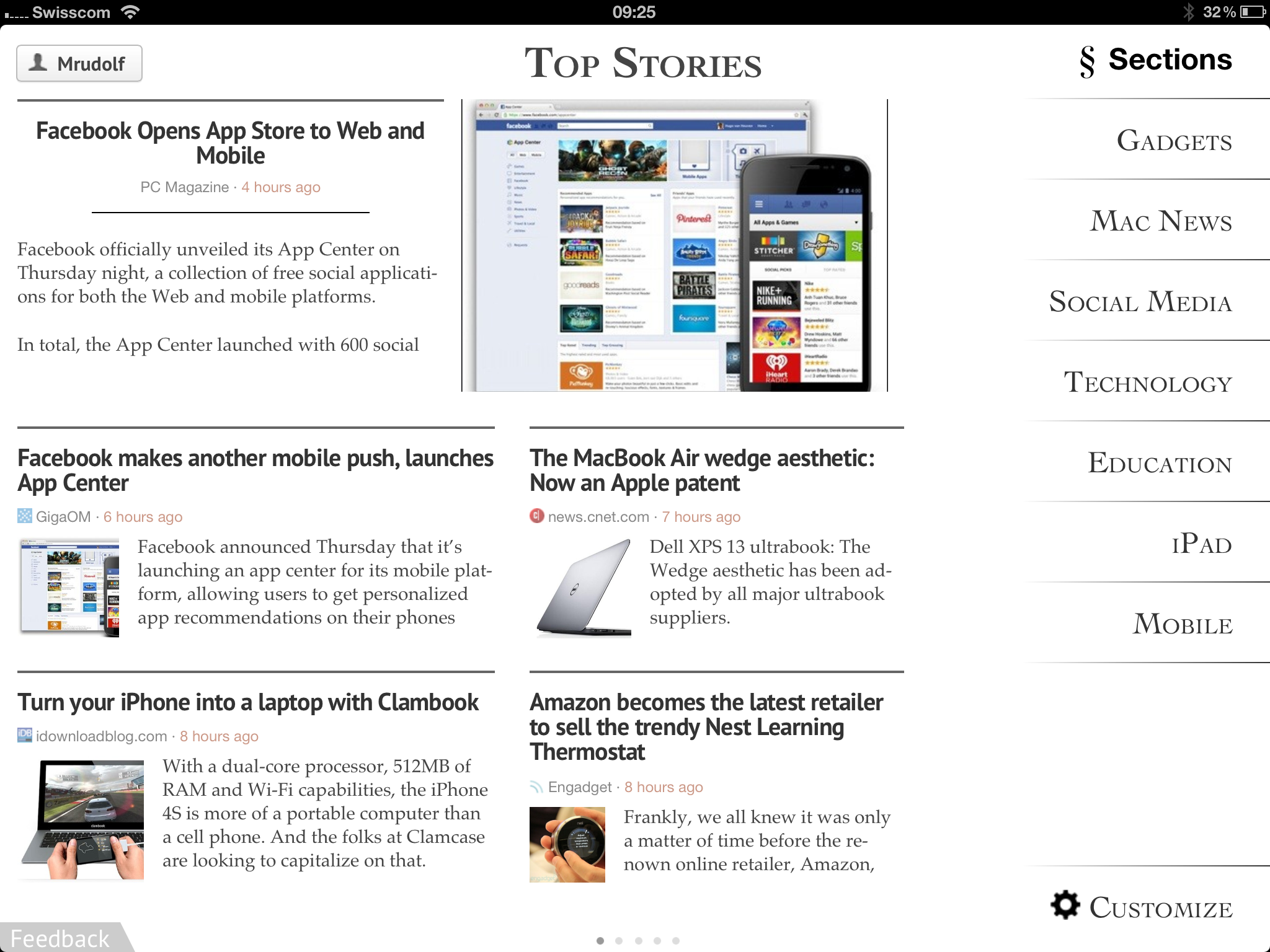 A new colleague at HTW Chur (thanks to Tanja) gave me a very useful hint: When I mentioned Flipboard as one of my favorite apps for the iPad, she recommended me Zite, another personalized magazine.